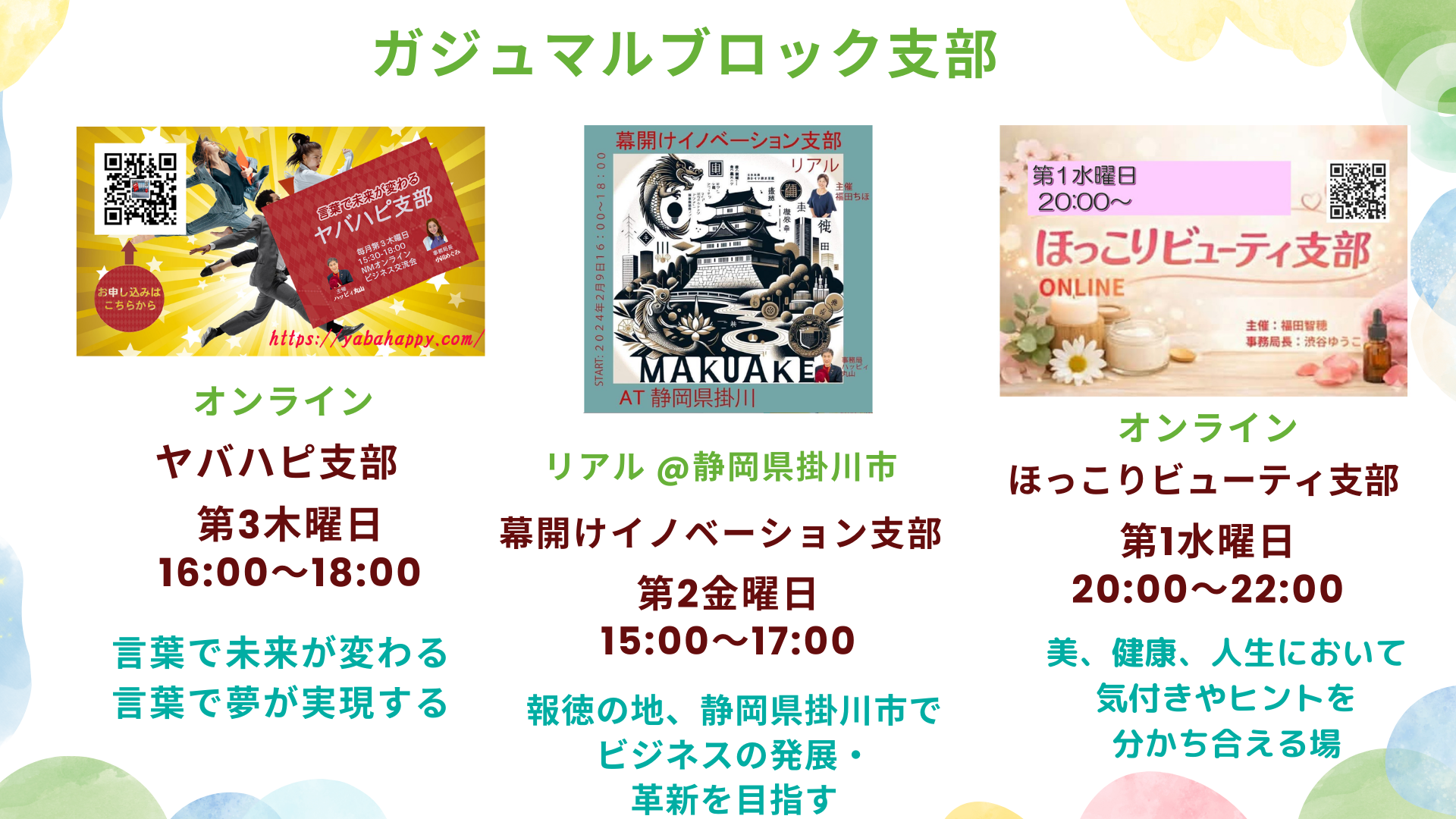 報徳の地・掛川で、徳川ゆかりの地・静岡で、みなさんのビジネスが革新、発展できるコミュニティを目指します。